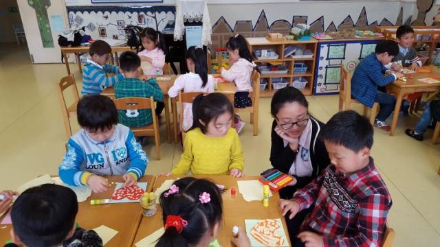 最后,每位小朋友都收到了一张粘有心形纸片的正方形纸片,在志愿者的指导下小朋友们将装饰彩纸撕成了小碎片,贴在了心形卡片上,将“心”填满。成型后的爱心卡片五颜六色,汇聚了童真和爱意,小朋友们纷纷在卡片背面画出了爱的寄语,用心地传递着他们对家、对父母的依恋与热爱。