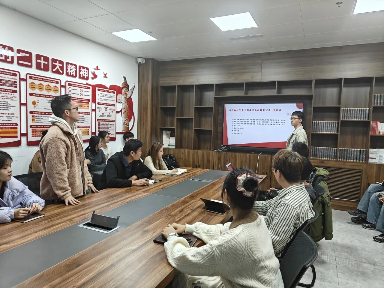 活动伊始,学生党员肖涵以深沉而庄重的语调带支部成员进入董存瑞故事的分享学习之旅。在那个战火纷飞、山河破碎的年代,董存瑞自幼目睹了日本侵略者的残暴和人民生活的苦难,随着年龄的增长,他对国家命运的责任感愈发强烈,毅然投身革命事业,成为一名光荣的解放军战士。1948年,在进攻隆化县城的战斗中,董存瑞“舍身炸碉堡”,用自己年轻的生命为部队的胜利开辟了道路,牺牲时年仅19岁。分享过程中,全场师生都深刻感受到革命先辈的精神感召,对其满怀敬意与缅怀。