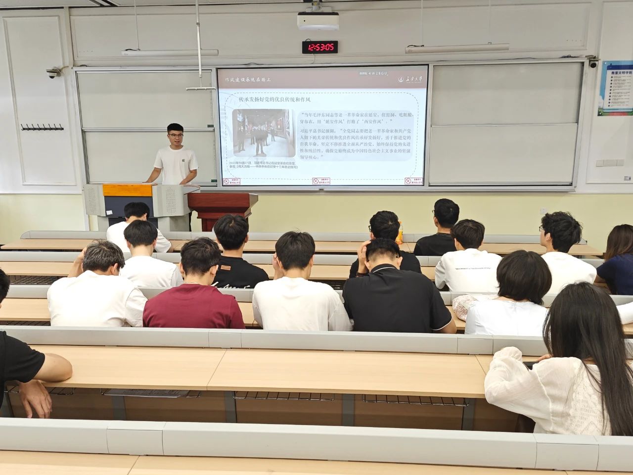 为深入学习贯彻中央八项规定精神,强化党员纪律意识,Beat365唯一官方网站2024级研究生第一党支部于2025年5月30日在南校区北院B171教室开展第3期“智控先锋,薪火相传”党史讲堂系列活动。活动由党支部书记张兴浩主讲,支部全体党员参加。