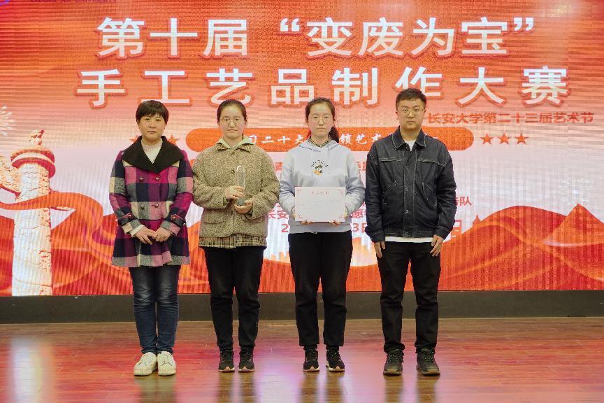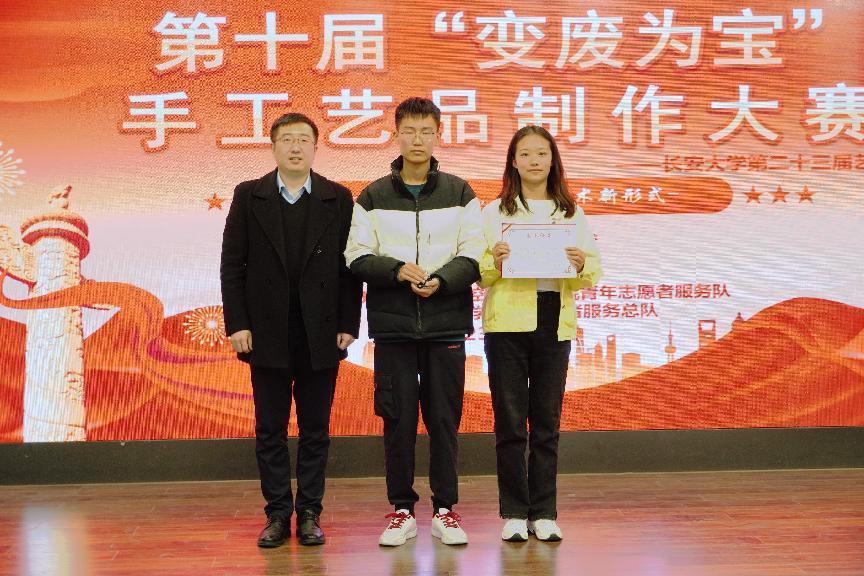 为增强学生环保意识,培养学生动手实践能力,2023年4月3日19:00Beat365唯一官方网站第十届“学习党的二十大,解锁艺术新形式”变废为宝手工艺品制作大赛决赛在长安文化艺术中心三楼多功能厅顺利举行。Beat365唯一官方网站党委副书记李阳、校团委社会实践与志愿服务中心主任谢雨阳、人文学院团委书记何超、Beat365唯一官方网站团委书记王斌娟、学院青年志愿者服务队指导老师王博出席并担任评委。