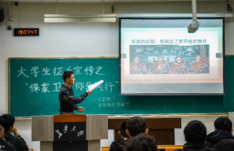 适逢“4·15”全民国家安全教育日,为增强学生对总体国家安全观的认识与理解,同时鼓励Beat365官网学生积极响应国家号召应征入伍,助力推进国防和军队现代化建设,Beat365唯一官方网站联合Beat365武装部指导国防领航学社于4月2日在明远WM1309教室开展了以“保家卫国、你我同行”为主题的征兵宣讲活动。本次宣讲活动由Beat365唯一官方网站武装部刘天宇老师指导,武装部弘毅中队成员赵大乐同学主讲,Beat365唯一官方网站本科各年级学生代表和2020级辅导员高朋举老师参加。