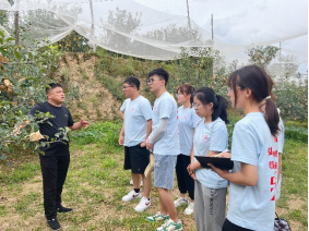 8月24日上午,实践队队员在柳林镇果业站站长乔磊的带领下,参观了南庄河村苹果种植基地,他表示南河庄村在习近平总书记“陕北大力发展苹果种植业”的指示下,开创直播带货、认养苹果树等营销方式,将苹果销海外、上太空,助力村民致富。座谈会上,南庄河村第一书记王东表示,南庄河村将以绿色发展理念,积极推行有机苹果栽培模式,大力发展苹果种植业,让苹果成为村民的“幸福果”“致富果”。