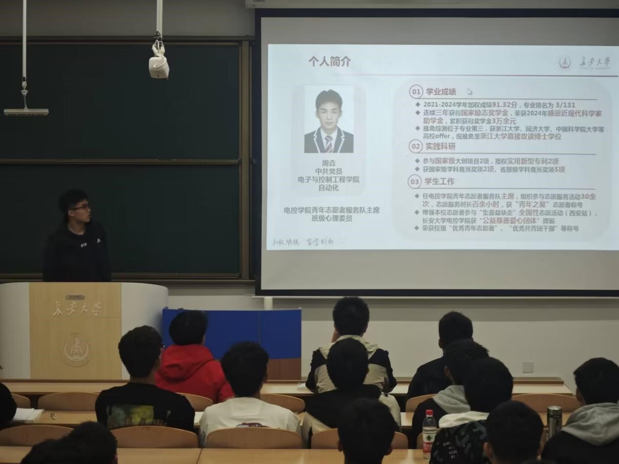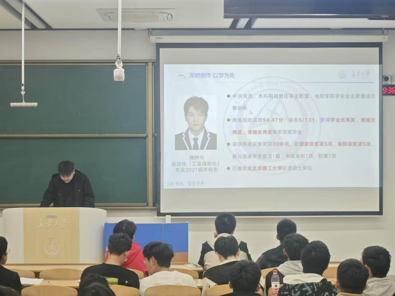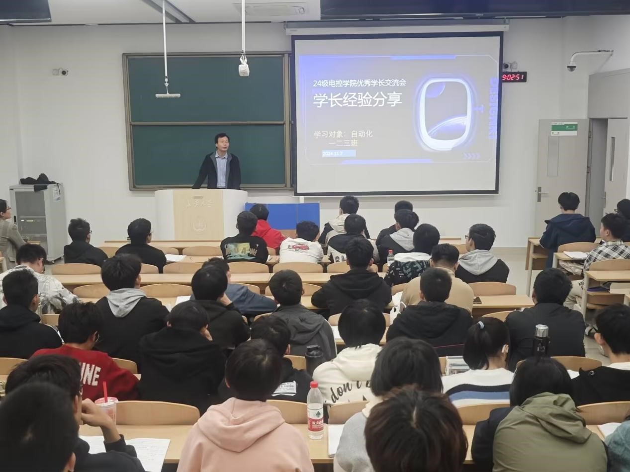 为充分发挥优秀典型的榜样示范作用,营造良好的学习氛围,进一步强化学院学风建设,Beat365唯一官方网站““优秀学长经验交流会”于11月7日晚上19点在WH1101教室召开,会议邀请2021级保研学生高晓轩、楼钟元、周垚作经验分享,2024320101班班主任周经美,2024320101、2024320102、2024320103班全体同学参加会议,会议由自动化系副主任杨盼盼主持。