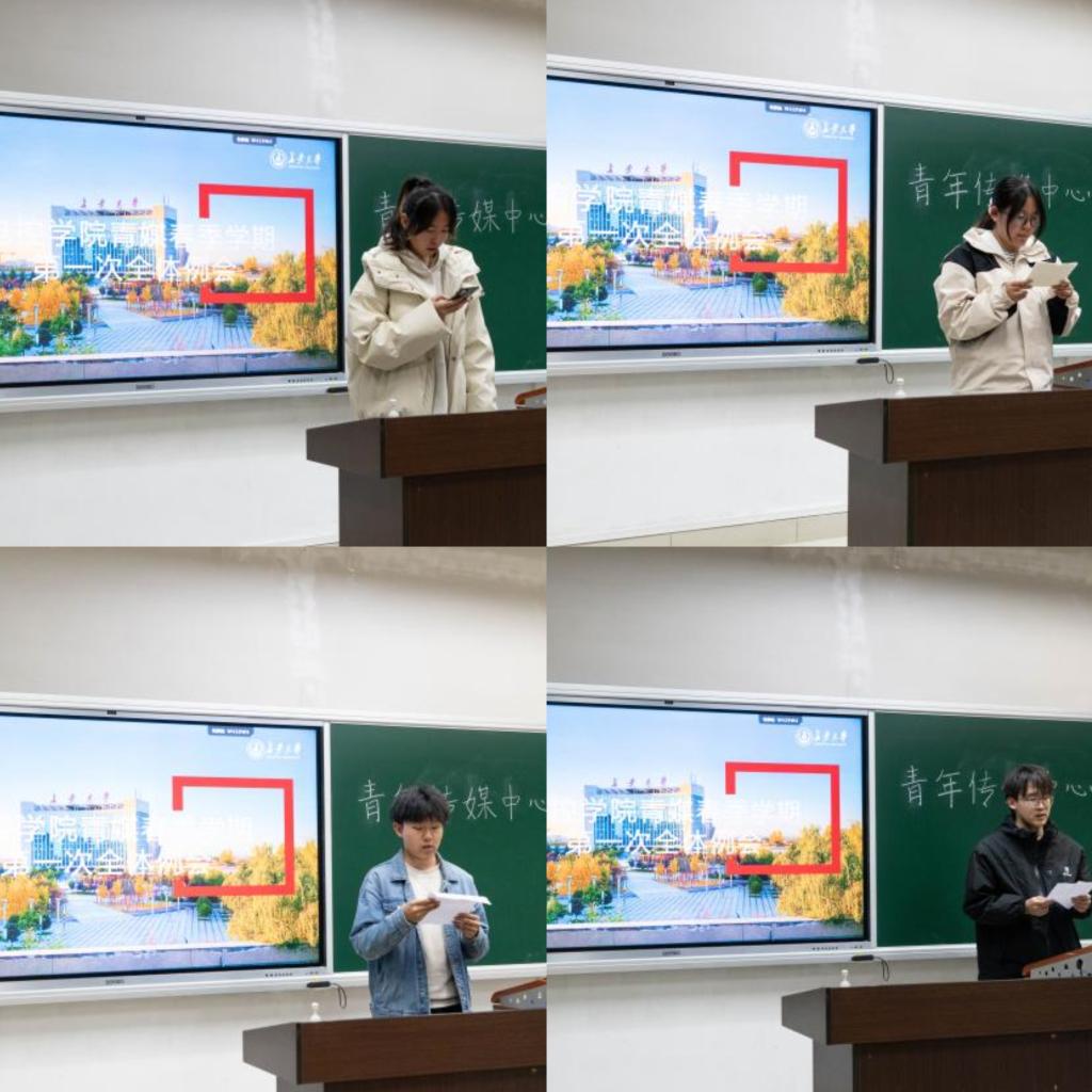 王佩佩结合自身的工作经历,对各部门工作提出要求,他希望各位同学在工作过程中以服务同学和自我提升为双重出发点,不仅要做好宣传工作,也要在实际工作过程中提升自身实力。李慧提出,学院青媒有着良好的工作基础,全体成员应凝心聚魂,以提升学院青媒的校园影响力为己任,继续锐意进取,祝愿青媒组织和组织成员们都能在今后取得更加优异的成绩。