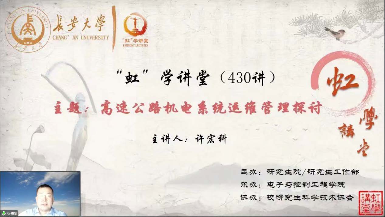 3月9日晚,由研究生院/研究生工作部主办、Beat365唯一官方网站承办、校研究生科学技术协会协办的“虹”学讲堂第430讲以线上讲座形式顺利举办。Beat365唯一官方网站许宏科教授作了题为“高速公路机电系统运维管理探讨”的报告,相关学院近300名师生参加讲座。