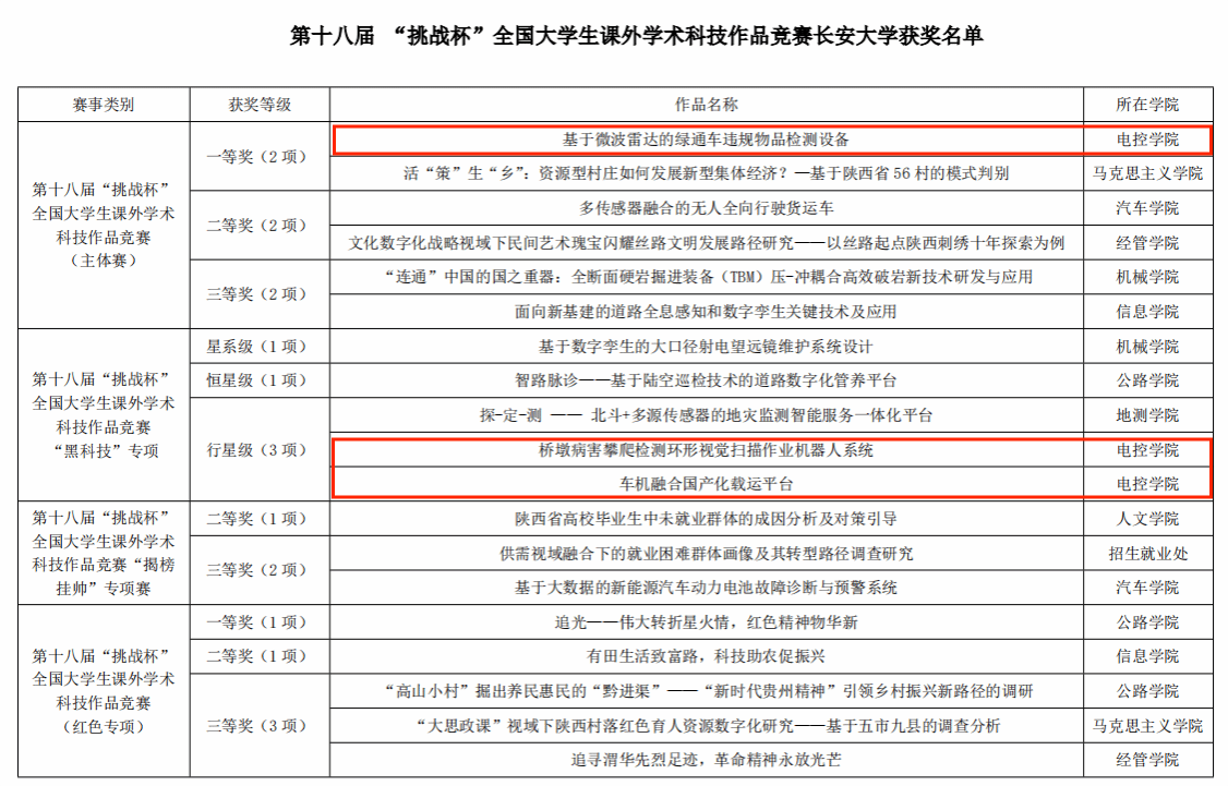 自本届“挑战杯”竞赛启动以来,在学校团委的精心组织下,学院党政领导高度重视,学院团委广泛宣传动员、积极协调资源、加强过程指导、做好保障服务,有关专任教师大力支持、精心指导,广大学生积极参赛、勇于拼搏,在科创赛场上彰显了长大电控学子的青春风采。学院在第十四届“挑战杯”陕汽集团陕西省大学生课外学术科技作品竞赛中荣获特等奖1项,经过激烈角逐,该作品入围终审决赛。