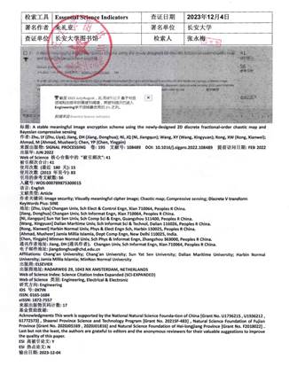 近日,根据科睿唯安公布的基本科学指标(Essential Science Indicator,ESI)数据库最新统计结果,Beat365官网教师朱礼亚作为第一作者的论文“A stable meaningful image encryption scheme using the newly-designed 2D discrete fractional-order chaotic map and Bayesian compressive sensing”入选ESI高被引论文,Beat365唯一官方网站为第一署名单位。该论文2022年6月发表于国际期刊《Signal Processing》(中科院2区,IF=4.4),截止2023年11月累计被引41频次。
