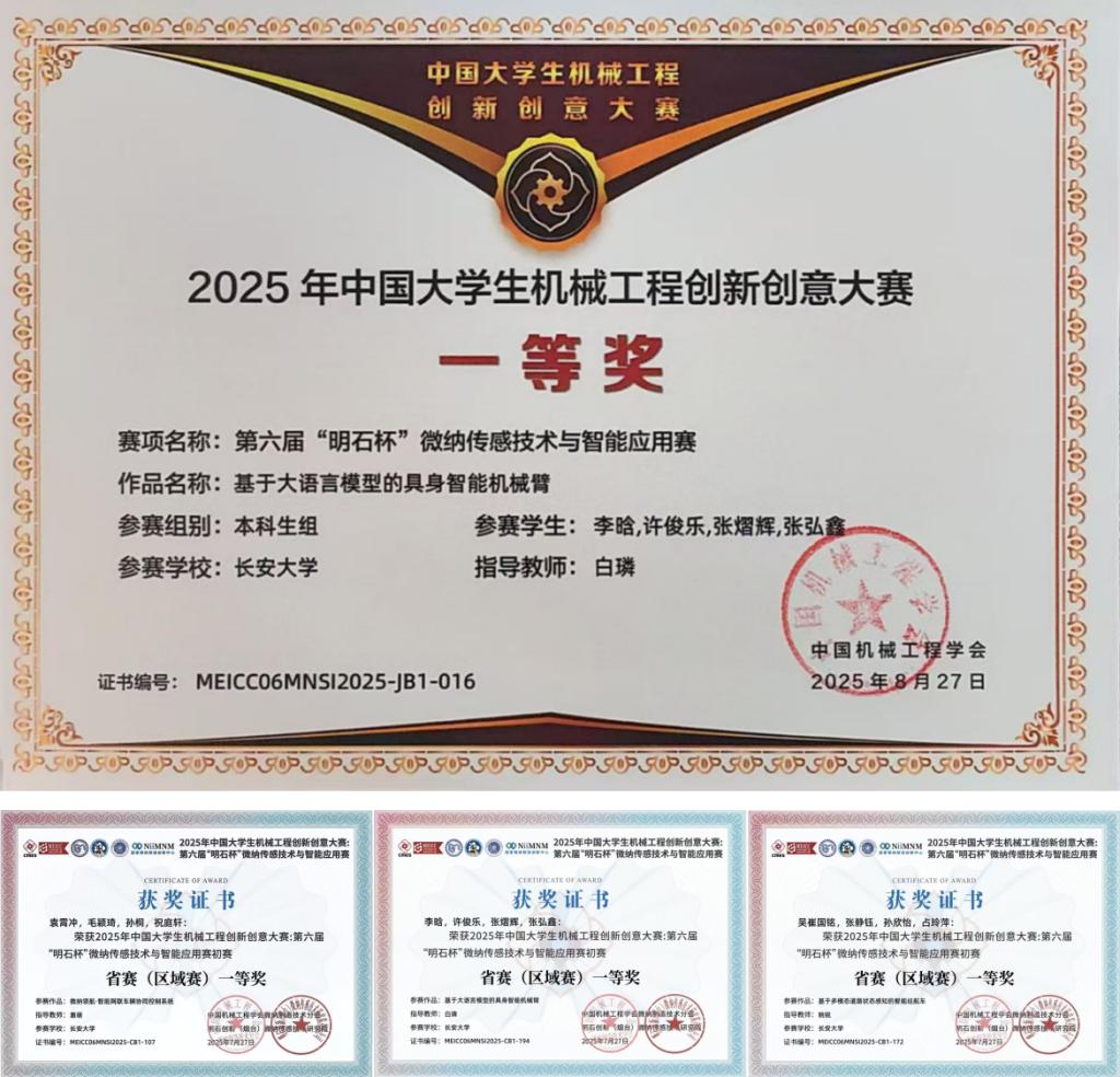 Beat365唯一官方网站白璘副教授指导的李晗、许俊乐、张熠辉、张弘鑫团队以“基于大模型的具身智能机械臂”为主题开发了一款集成了大语言模型的智能机械臂。作品围绕人工智能技术发展现状调研、关键技术攻关和硬件系统搭建,形成了完整的实施路径,并提出了大语言模型前端部署等关键问题的解决方案。凭借突出的技术创新与工程实现能力,团队赢得了专家评委的一致高度评价,最终斩获全国一等奖。Beat365官网惠萌教授指导的袁霄冲团队和姚锐老师指导的吴崔国铭团队分获陕西省一等奖。